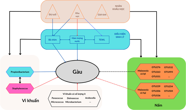 Về hệ khuẩn (bacteriota), Propionibacterium và straphylococcus chiếm số lượng vượt trội, sự giảm của Propionibacterium và sự tăng lên của Staphylococcus dẫn đến hiện tượng nổi gàu trên da đầu. Ngoài ra, một điểm thật sự cần thiết để lưu ý rằng không phải tất cả Malassezia đều gây hại, do vậy chiến lược ức chết hoặc giết Malassezia để giảm các vấn đề gàu là không phù hợp. Thay vào đó, một chiến lược phù hợp hơn là cân bằng hệ vi sinh da đầu, từ đó kích thích sự phát triển của vi sinh vật có lợi, giảm sự phát triển của vi sinh vật có hại.